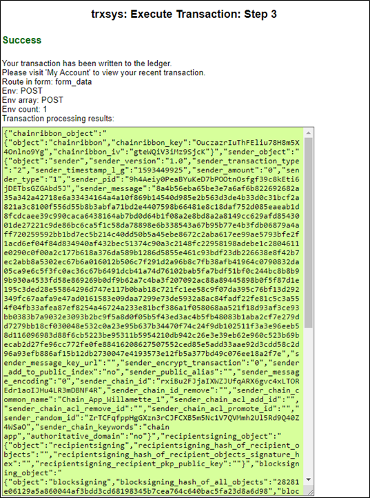 Above: If all went well, then a "Success" message with the transaction record written ledger will be displayed.